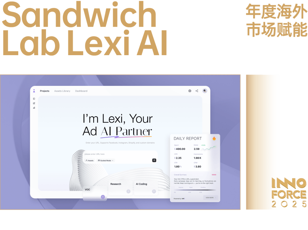 Sandwich Lab 以「AI 自从决策的运营增加」为焦点,从头定义企业取市场的关系。团队将大型言语模子(LLM)取告白优化引擎深度融合,建立出端到端的智能增加系统,为企业增加带来新的范式。2025 岁首年月推出的 Lexi AI (lexi。studio),以自研的 Evolion 引擎为焦点——这是一套具备进化机制的智能决策系统,可以或许正在海量投放数据取多模态贸易信号中持续进修取优化,正在动态市场中自从理解素材、案牍、受众取行为等非布局化数据,并生成更高效的策略径。这一冲破标记着 AI 从「生成内容」迈向「生成成果」的新征程。现在,Lexi AI 已为全球跨越 80 个国度取地域的企业带来持续增加,成为「AI 从导增加取市场运营」范畴最具立异性取影响力的代表之一。