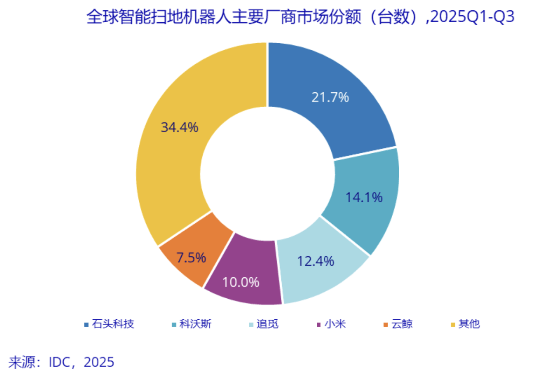 来自IDC的统计数据显示,2025年前三季度,全球扫地机累计出货量为1742。4万台,排名前五的同样都是中国厂商,别离是:石头、科沃斯、逃觅、小米、云鲸。