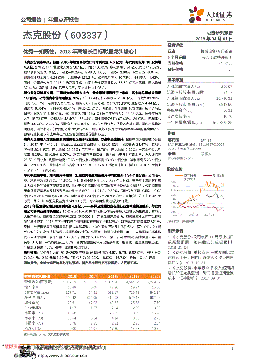 天风证券*公司研究*优良自始自终,2018年高增加方针彰显龙头大志!--杰克股份(603337)公司演讲年报点评演讲 1 杰克股份(603337) 证券研究演讲2018年04月01日投资评级行业机械设备/公用设备6个月评级买入(维持评级) 当前价钱51。92元方针价钱 元根基数据A股总股本(百万股) 206。67 畅通A股股本(百万股) 54。77 A股总市值(百万元) 10,730。31 畅通A股市值(百万元) 2,843。66 每股净资产(元) 10。31 资产欠债率(%) 40。70 一年内最高/最低(元) 54。78/29。85 做者 邹润芳阐发师SAC执业证书编号:S04 朱晔联系人 材料来历:贝格数据相关演讲1 《杰克股份-公司点评!11月行业出口数据超预期,龙头继续加快兴起!国内工缝龙头逐渐迈向国际巨头》 2017-10-31 3 《杰克股份-半年报点评!收入超预期增加印证龙头逻辑,利润增速短期受累成本、汇率影响》 2017-09-04 股价走势优良自始自终,2018年高增加方针彰显龙头大志! 杰克股份发布年报,披露2018年运营方针为归母净利润达4。6亿元,取此同时拟每10股转增4。8股。