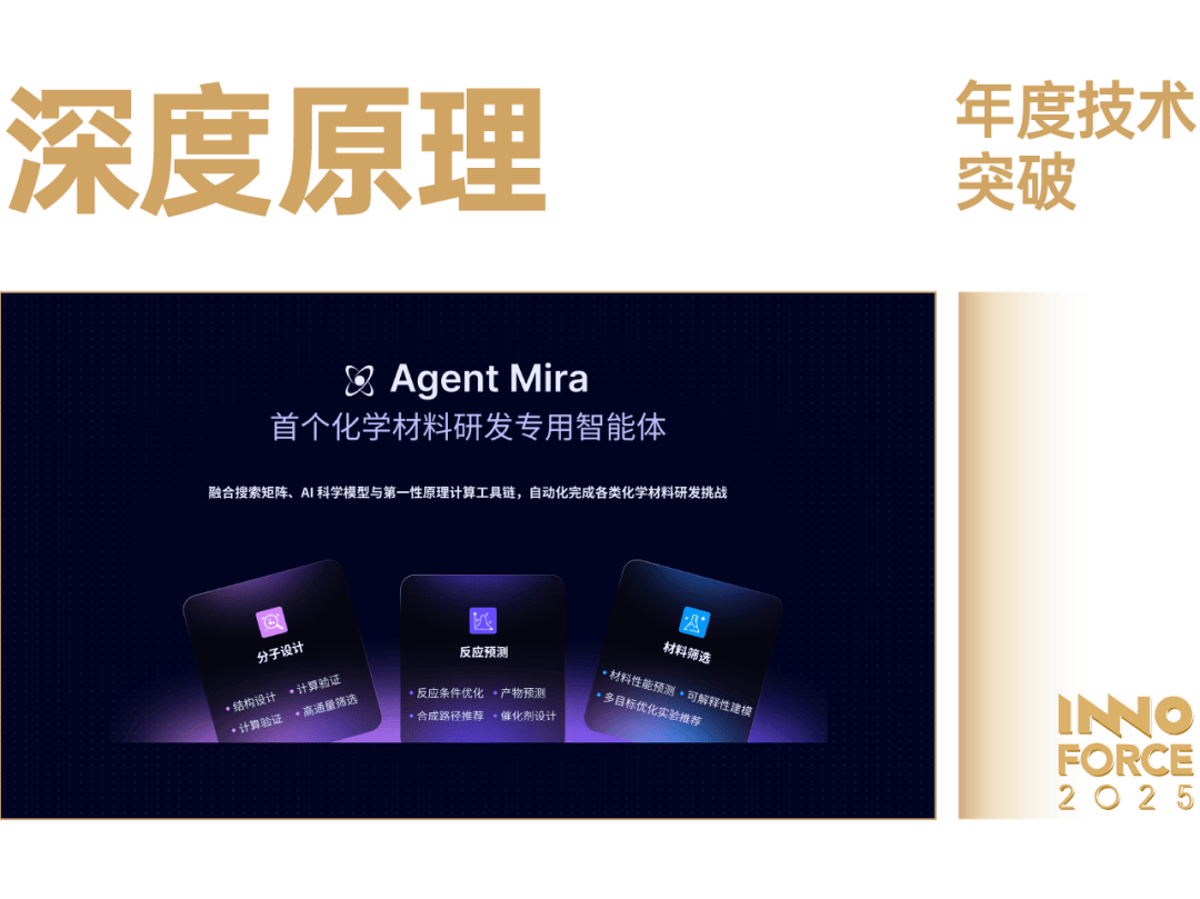 深度道理初次将前沿的生成式 AI 模子成功使用于量子化学范畴,为新材料以及高效催化剂的发觉斥地了全新的「AI 设想」范式。公司于 2023 年推出的首个 3D 化学反映扩散生成模子 OA-ReactDiff,初次实现了正在单个 GPU 上 6 秒内完成过渡态布局预测,处理了保守量子化学计较耗时数天以至数月的行业痛点;2025 岁首年月公司进一步发布迭代升级模子 React-OT,将预测时间逾越式提拔至 0。4 秒,误差降低超 25%,对未见反映及复杂反映系统的顺应性也显著提拔。同时深度道理推出的 ReactiveAI 平台,整合生成式架构、反映收集、保举算法等手艺,打制材料研刊行业的破局利器。这个平台的焦点,正在于它能让 AI 理解化学反映的素质。简单来说,化学反映最环节的,是反映物变为产品的那一「霎时」,这被称为「过渡态」。深度道理的立异正在于,他们不再盲目试验,而是利用生成式 AI(如其 React-OT 模子),正在量子层面精准模仿这一「霎时」。这种模仿将需要超等计较机数天才能完成的复杂计较,缩短到了几秒钟。深度道理的手艺立异,是实正将 AI 用于最根本的科学发觉。他们通过 AI 决策链,将机械进修、量子化学计较和高通量尝试整合成一个闭环。这套系统不只能千倍速地加快研发,更主要的是,它能以史无前例的精度,正在复杂的材料空间中定位最有潜力的候选者,并尝试的标的目的。深度道理的冲破,正在于它为 AI 找到了一个极具价值的新「场景」——根本科学研发。它证了然 AI 不只能优化现有流程,更能做为一种新的「显微镜」和「加快器」,去摸索微不雅世界的底子纪律,从而正在泉源上处理能源效率、碳排放、新材料等弘大挑和。它让「AI 炼金术」成为了现实。