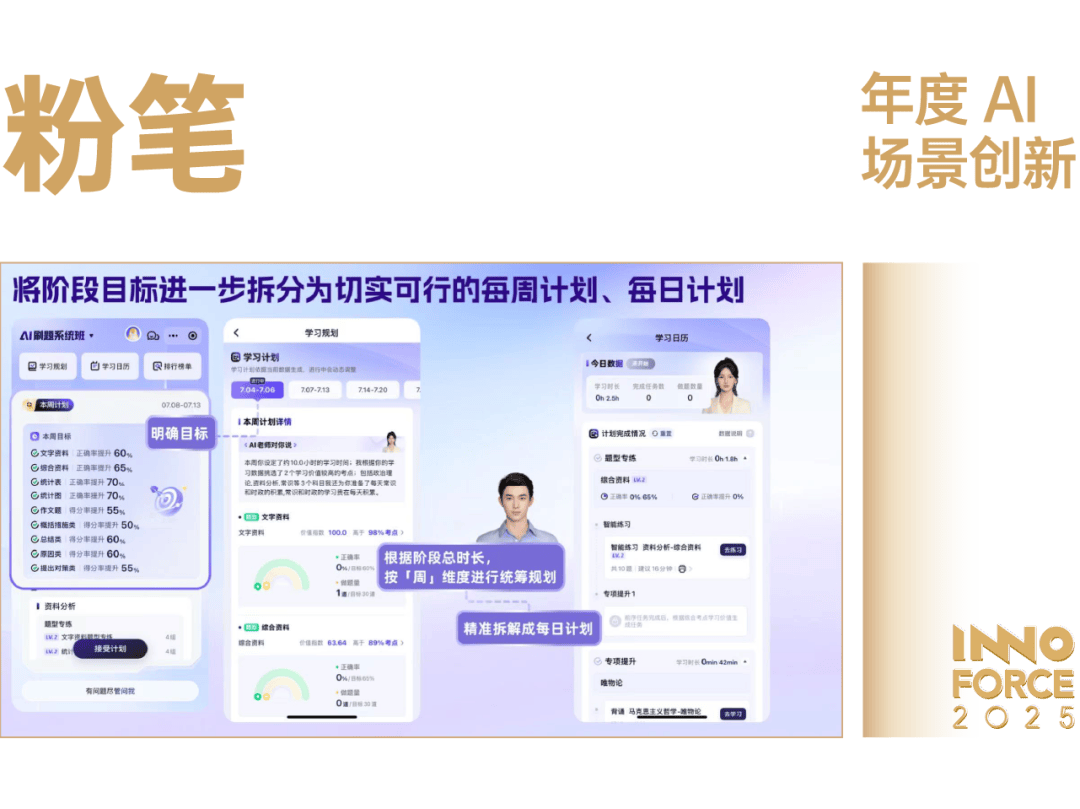 粉笔开创性地以「自研垂域大模子」为焦点,将 AI 深度使用于、教资等职业教育的焦点备科场景,成功打制了中国职业教育范畴,首个实现 AI 使用场景规模化落地取贸易闭环的典范。正在手艺层面,粉笔第一次退职业教育范畴,基于超 7000 万用户的进修反馈取资深教研数据,锻炼出表示优于通用大模子的垂域大模子,处理了公考等专业场景下「AI 不敷懂行」的难题。正在产物层面,它不只是做「AI+东西」,而是建立了「AI 教员+AI 面试+AI 刷题班+AI 硬件」的完整进修闭环,以「名师+AI 数字人」双师模式,打破了保守「一刀切」的课表,实现了千人千面的个性化高效备考。自 2024 年推出垂域大模子以来,粉笔的 AI 产物矩阵敏捷成为其「新增加点」。截至 2025 年,AI 使用已累计办事超 1500 万用户,付费用户数超 150 万,让职业教育获得了 AI 能力的沉塑。粉笔的冲破不只是单一的产物立异,更是对保守职业教育「千人一面」模式的深刻变化。它凭仗正在「垂域大模子」上的初创性摸索,以及对「AI 产物矩阵」的快速结构,无力冲击了「名师资本稀缺、个性化高贵」的行业痛点,为数万万考生供给了更高效、更普惠的智能教育处理方案,很好地注释了「AI 教育立异」的价值。
