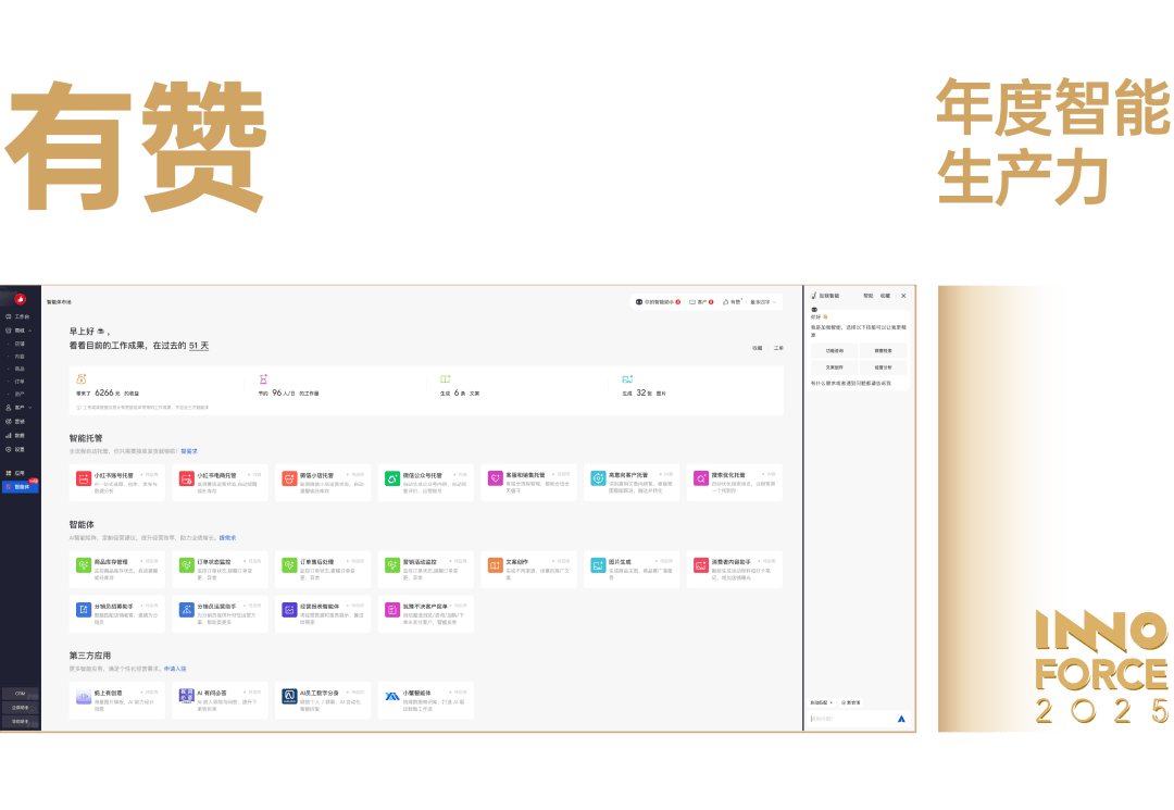 正在存量合作时代,当「降本增效」成为所有商家的焦点命题,有赞为零售行业供给了全新的解法。它系统性地将 AI 能力注入其 SaaS 办事,将本人从一个「SaaS 东西箱」,升级为取商家共担运营目标的「智能出产力伙伴」,正正在深刻地改变中国商家的运营体例。这不只是简单的替代,更是对成本布局取人力价值的沉构,它把店长和员工从尺度化的流程中解放出来,让他们能回归到取人沟通、创制奇特价值的贸易素质。有赞的贡献代表了 Agentic AI 时代企业办事的进化标的目的:将来的软件,不再仅仅是供给能力的东西,更是间接交付成果的伙伴。它所建立的,是一个畴前端增加到后端提效的闭环智能托管系统,让每一个商家都能卸下运营的沉担,轻拆上阵,从头聚焦于贸易的立异取胡想。