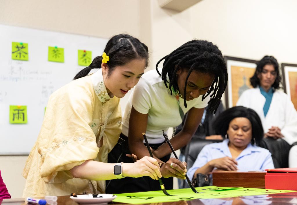 2025年4月17日,正在南非约翰内斯堡,学生取孔子学院意愿者正在“国际中文日”勾当上写毛笔字。记者 张誉东 摄!