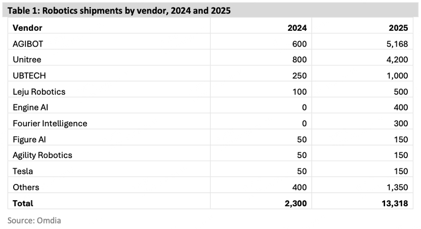也就正在CES 2026期间,市场调研机构Omdia给出了2025年全球人形机械人出货量统计数据,这份数据显示:2025年全球人形机械人出货量超1。3万台,此中全球出货量排名前六的企业,都是来自中国的团队,它们别离是智元、宇树、优必选、乐聚、众擎、傅利叶,排名第一的智元出货量达5168台。